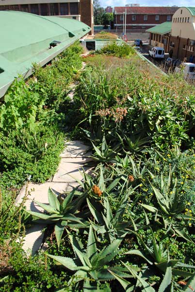 - Was used as a testing sight for a small direct green roof on a corrugated asbestos roof. The necessary layers were applied and finished off with totally indigenous grasses, shrubs and ground covers.